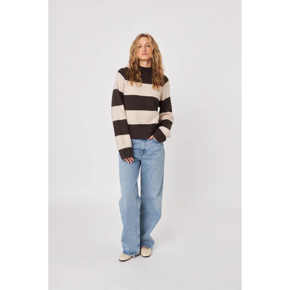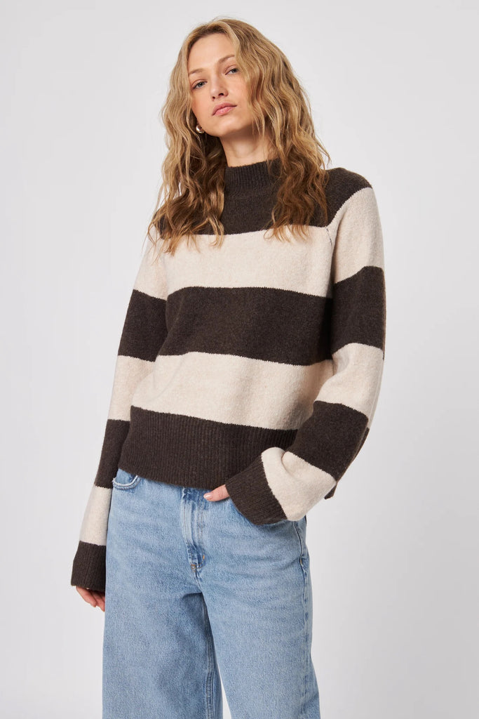 The Edison Relaxed Fit Turtleneck Knit Sweater in mocha stripe offers cozy warmth with a laid-back silhouette perfect for crisp fall days. Its soft knit fabric and classic turtleneck design provide comfort and gentle coverage, while the subtle mocha stripes add seasonal style. Ideal for layering or wearing on its own, this sweater brings effortless autumn charm to your wardrobe.